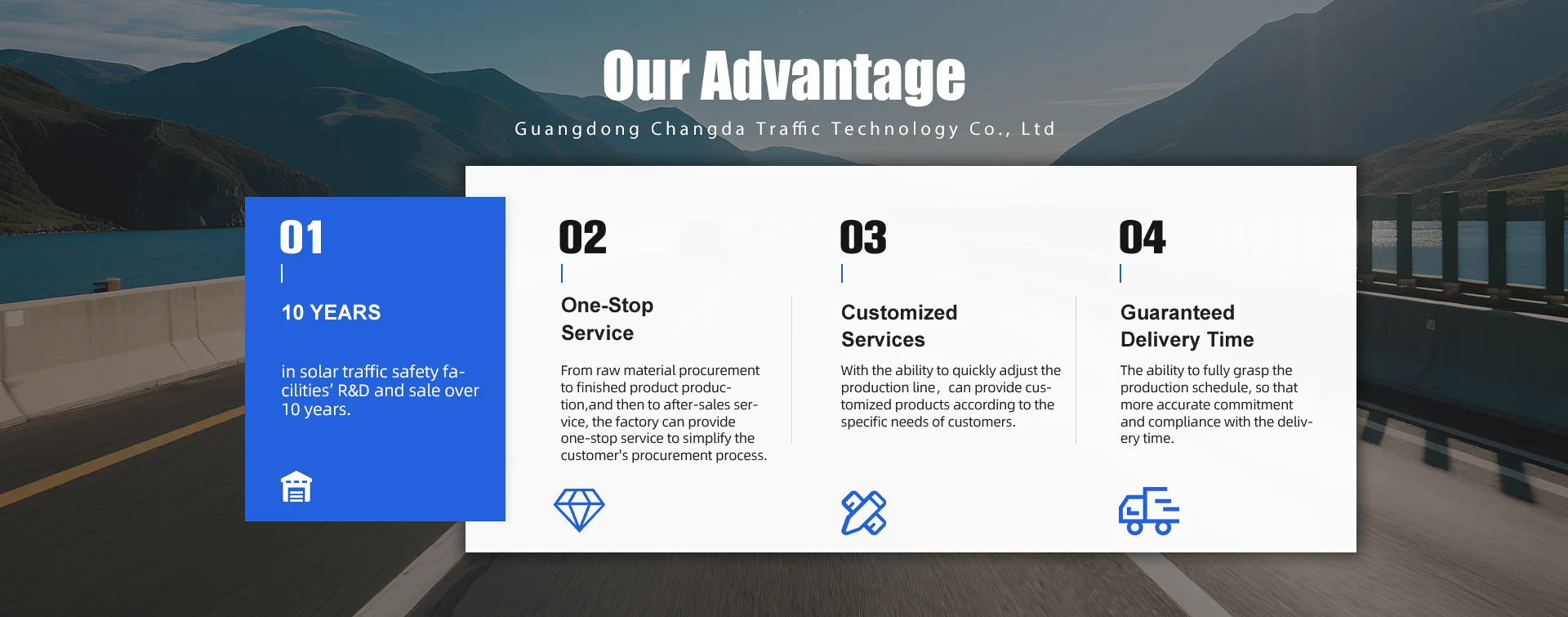 Principais produtos:Estrada solar Stud/estrada reflexiva Stud/sinal de trânsito/semáforo/delineador
